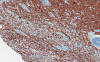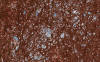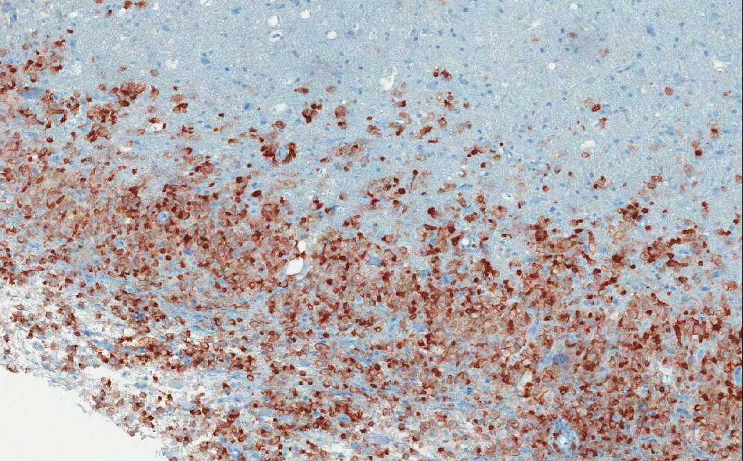 CD163: This is a marker for macrophages and the immunohistochemistry highlights the macrophages (brown cells). This photo is also taken from area 1 and you can see the well demarcated macrophages from the white matter with preserved myelin. Note that there are also some macrophages infiltrating into the white matter where myelin is still present but the number is small. It may be difficult to identify these cells based on morphologic features alone and immunohisochemistry for CD163 is a big help in identifying these cells. |