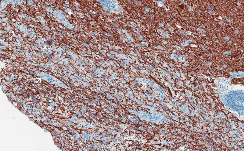 Glial fibrillary acidic protein (GFAP): GFAP is also an intermediate filament and is found in astrocytes. The image here demonstrate a dense mesh of GFAP cytoplasmic processes with foamy macrophages (white arrows) scattered in between. Astrocytes has star like processes which makes them look like a star and hence their name (black arrow). Click here to see another image of stellate shaped reactive astroytes stained for GFAP. This dense mesh of astrocytes is abnormal and is resulted from proliferation of reactive astrocytes due to the demyelinating process. |