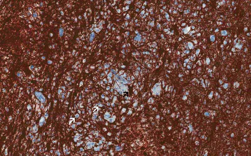 Neurofilament proteins: Neurofilament proteins are intermediate filaments. A large amount of them are found in the axons and therefore immunohistochemistry for neurofilament proteins would allow us to demonstrate the proteins. Some silver based stains such as Bodian stain is also appropriate for this purpose. This photo is taken from the same area similar to the one used in CD163. You can see foamy macrophages (arrows) on one side of the image but not the other side. In between the macrophages are axons that are positive for neurofilament proteins. Compare this with the Luxol Fast Blue and PAS stained section, you can see that there is tremendous loss of myelin in area infiltrated by macrophages but the axons are preserved. This is a key feature of demyelinating disease. |