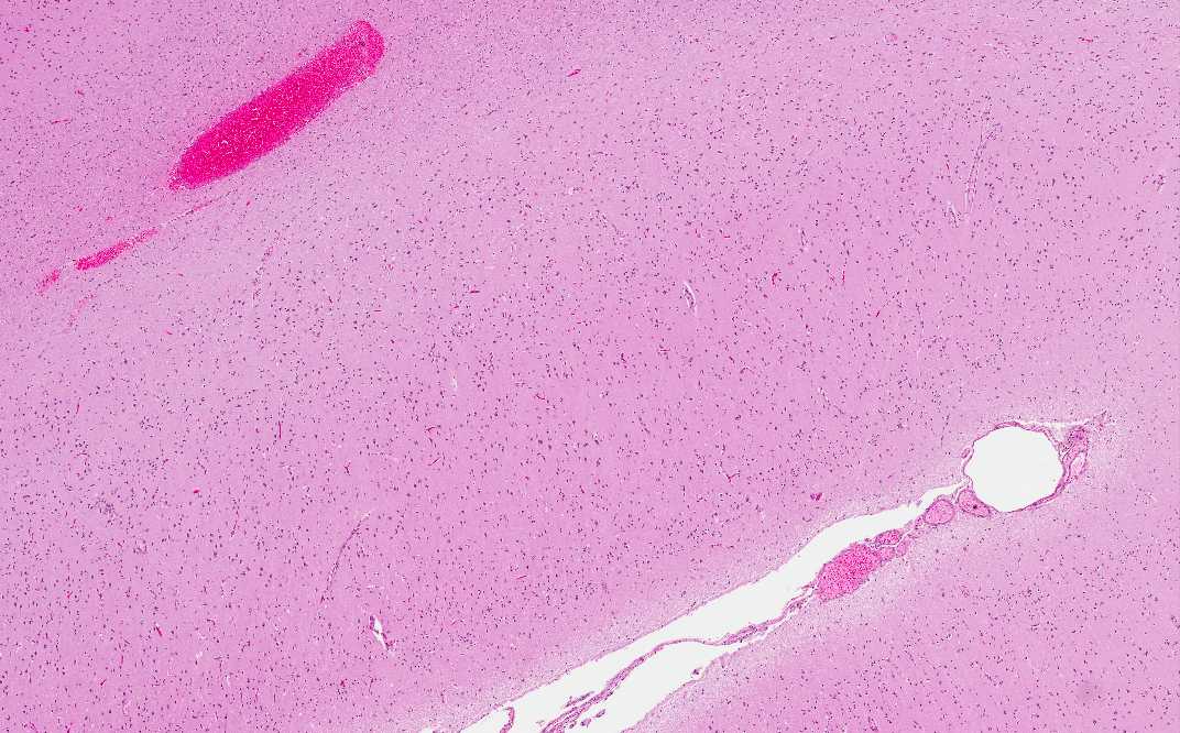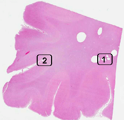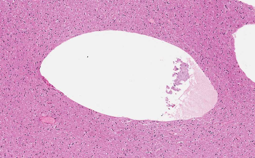 Area 1: Note that this vacuoles is largely empty except for a minute amount of acellular substance. There is no inflammatory cells or gliosis around the vacuoles. |
