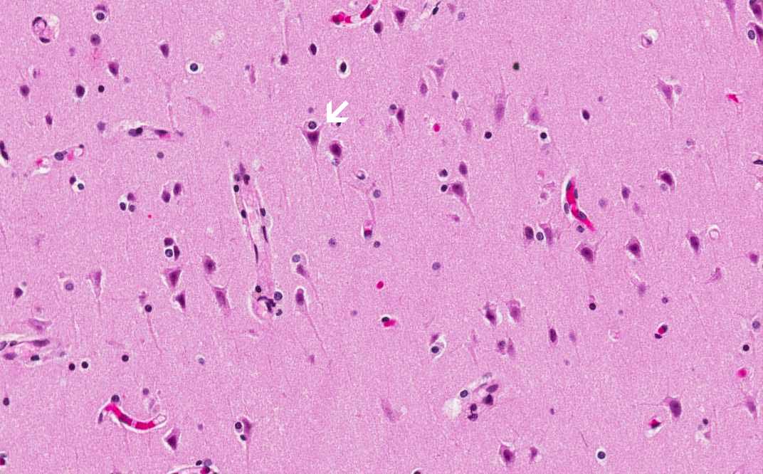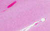 Area 2: The cerebral cortex does not look remarkably abnormal on low magnification. On higher magnification, you can see that the neurons (arrow) have lost their nuclear details and the nucleoli are not readily seen as in normal neurons. The shape of the neurons are also contracted and elongated which give the shape of a flame. The cytoplasm is also weakly eosinophilic. Compare these neurons with that of a cortex with no morphologic features of hypoxic/ischemic changes. The features being shown here is not the most advanced changes. The cytoplasm can get a lot more eosinophilic [click here to see an example]. |