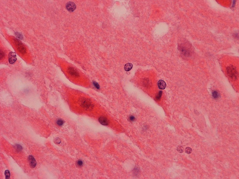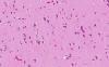 Comment: The formation of these vacuoles are due to postmortem proliferation of gas producing bacteria such as Clostridium species. The lack of inflammatory cell reaction is a testimony that this process occurred after death. Due to these vacuoles, this type of change is also nick-named "Swiss cheese brain" for obvious reason. It is rather common in the past when refrigeration for dead body would not be as readily available as today. As far as the body has been well refrigerated, Swiss cheese brain should raise a possibility of sepsis particularly associated with Clostridium species. |
