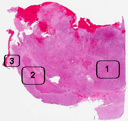 Area 3: The tumor (T) is overall very well demarcated from the surrounding brain tissue (B). This is also an unusual feature of glioblastoma or anaplastic astrocytoma which usually have an infiltrative margin. This features also explain why the tumor appears well demaracted enough to suggest meningioma on imaging studies. |
