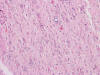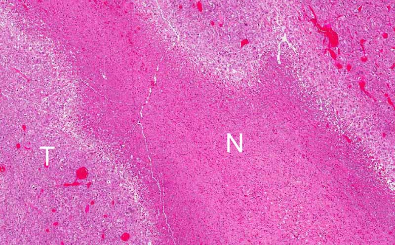 Area 2: Geographic areas of necrosis (N) is present in this tumor (T). Note that no pseudopalisading necrosis, one of the salient features of glioblastoma, is not see here. Compare the necrotic area in high magnification with that of the viable tumor cells. Note the loss of cellular details. |