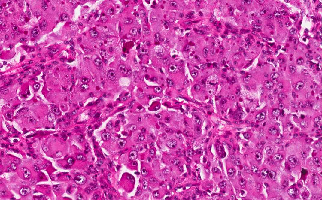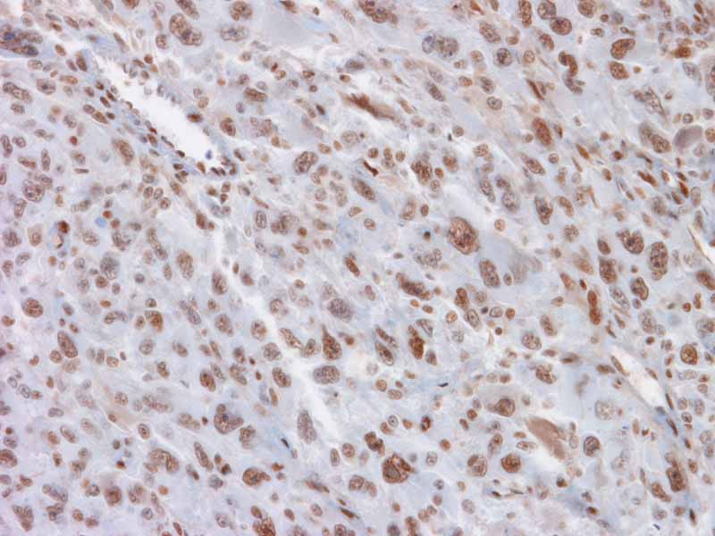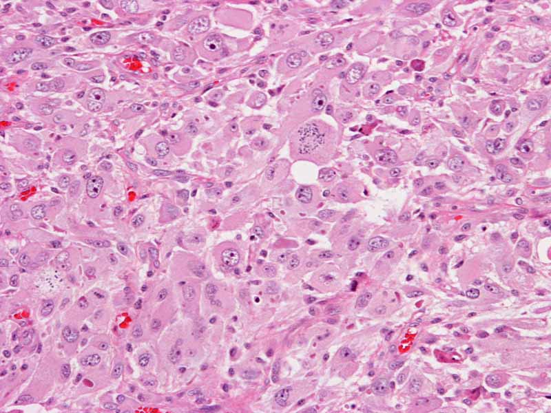 Area 1: The tumor is composed of large, pleomorphic cells with large nucleoli. The tumor cells are densely packed and without any pattern formation. The nuclei are large and there are prominent nucleoli. A moderate amount of cytoplasm is also present. The morphology varies from more spindle appearing to more epithelioid appearing. |