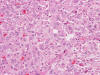 This image is taken from another slide of this case. In this area, the rhabdoid features are more prominent. Rhabdoid changes are featured by a large nuclei with prominent nucleoli. The cells is typically in an oval shape with a large belly of cytoplasm that pushes the nucleus to an eccentric location. Within the belly of cytoplasm is often a faintly defined inclusion body like body which may appear fibrillary on hematoxylin and eosin stain. This structure is composed largely of vimentin and will be strongly highlighted by immunohistochemistry for vimentin. |