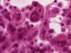 This image is taken from the cytologic prepartion of this case at the time of intraoperative consultation. The rhabdoid features are well shown here. Many multinucleated tumor giant cells are present. |