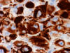 Vimentin: Practically every cell is immunoreactive for vimentin. Note the belly of strongly positive cytoplasm in the tumor cells. This feature is rather characteristic for rhabdoid cells. |