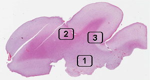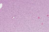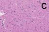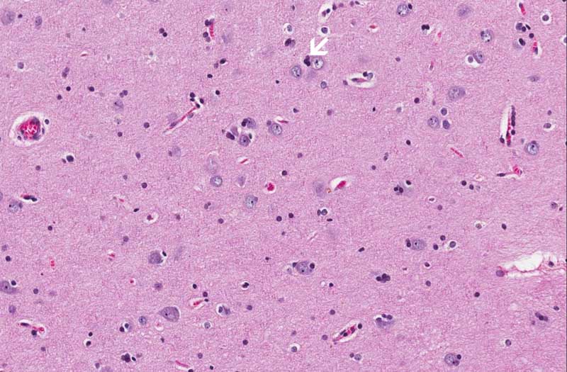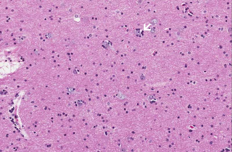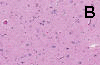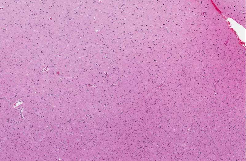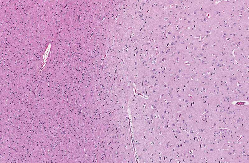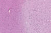 For Comparison: This is a section taken from the parietal lobe of a patient (autopsy) with no significant histologic abnormalities. You can compare the cellularity of the white matter and the sharp gray white matter distinction with the current slide. |