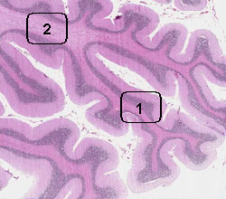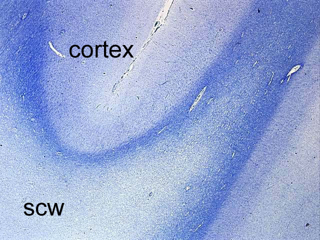 Loss of myelin: Myelin is staind blue in Luxol fast blue-Cresyl violet preparation. This image is taken from the cerebral cortex and subcortical white matter from a different case of x-linked adrenoleukodystrophy. Note that there is extensive loss of myelin in the deeper part of the subcortical white matter (scw). Myelin in the subcortical fibers are preserved. |
