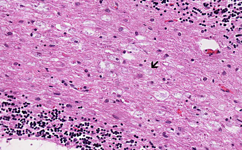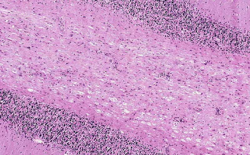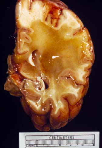 Gross Photo: This gross photo was taken from a different case. Note that the white matter is diffusely replaced by a yellow gelatin like substance. |