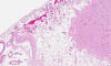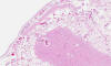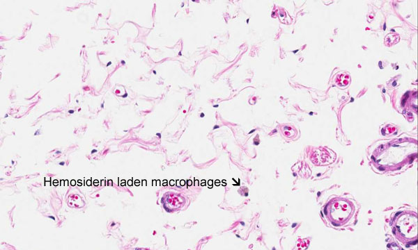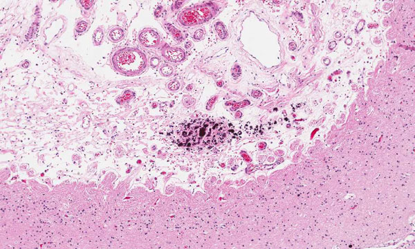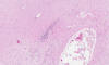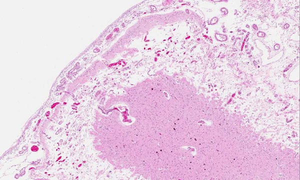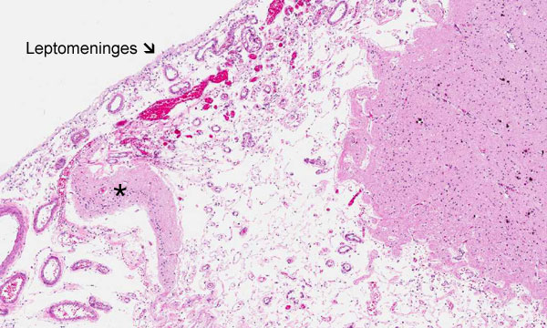 Area 1: Note that small fragments of gliotic brain parenchyma (*) are present under the leptomeninges. The space between the leptomeninges is filled with sparse fibrous tissue originating from the leptomeninges and blood vessels. Scant hemosiderin laden macrophages are also present. |