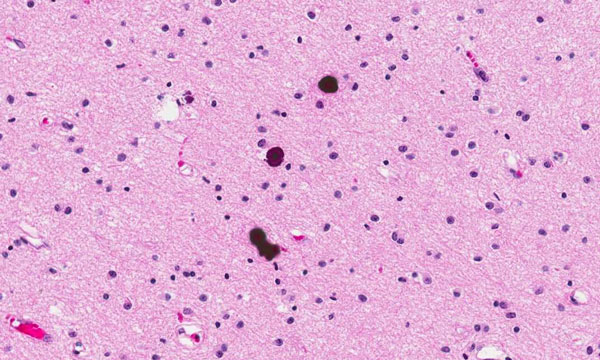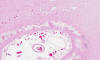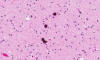 Area 2: The findings here is very similar to that of Area 1. Note the nodules of dark purple calcifications in the gliotic white matter. |