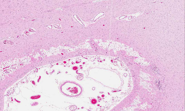 On autopsy, there was bilateral softening and subpial cyst formation involving the occipital lobes with its distribution consistent with the territory of posterior cerebral artery. The slide being shown here was taken from the occipital lobe.