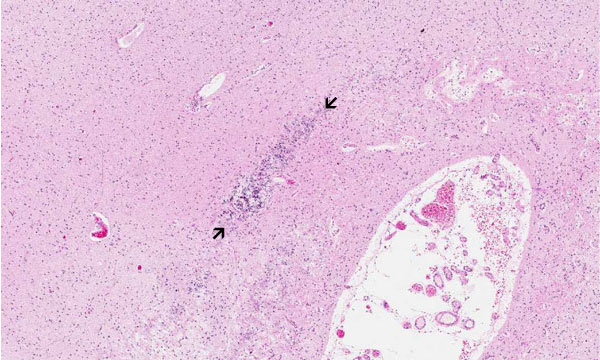Area 5: This is even less severely affected than Area 4. Note that the streak of calcifications (between arrows) follow the shape of the neuronal layers. |
