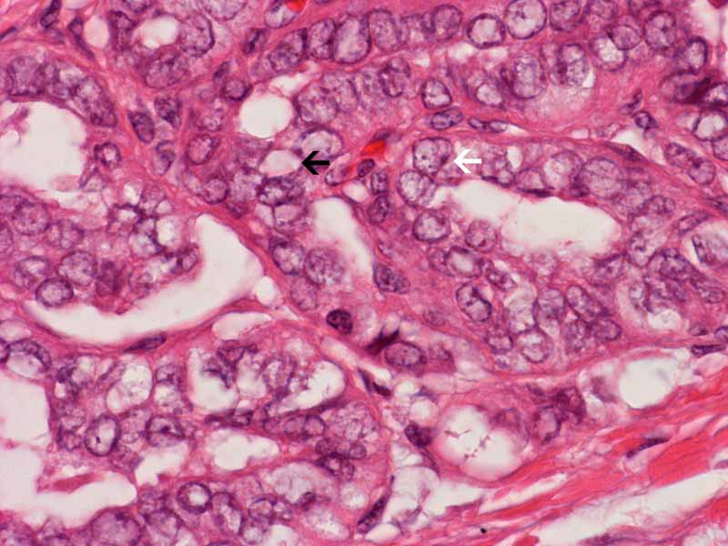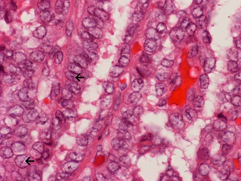 Nuclear features: These high-magnification photos illustrate the characteristic nuclear features of papillary carcinoma of thyroid which include enlarged nuclei with pale "watery" nucleoplasm, pseudonuclear inclusion (arrow in the left panel) and nuclear grooves arrow in the right panel). Overlapping of the nuclei is also a characteristic feature. |