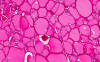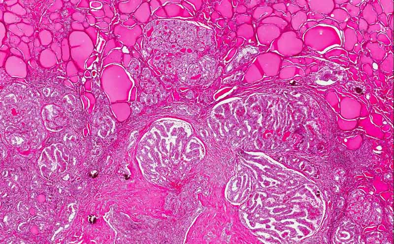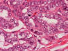 History: The patient was a 35 year-old woman who has a firm nodule palpable on her thyroid. A fine need aspiration was performed and reviewed papillary carcinoma of the thyroid. The current slides was obtained from the thyroidectomy specimen.