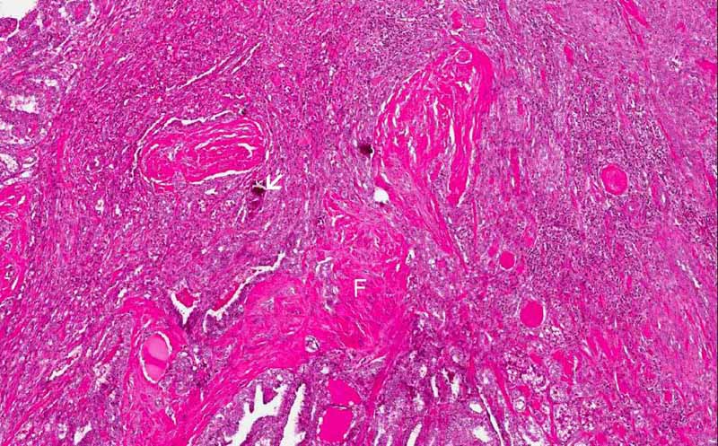 Area 4: Fibrosis (F) and calcifications (C) are characteristic features of thyroid papillary carcinoma. These calcifications can exists as amorphous depositioins or round, concentric psammoma bodies. |