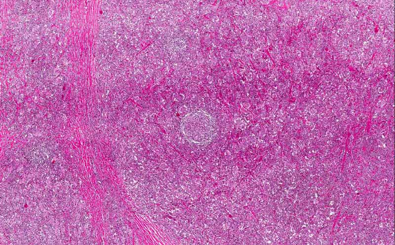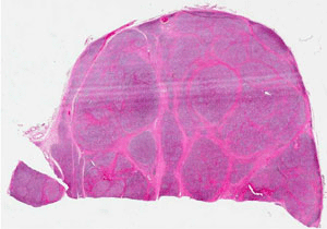 Capsule Summary: Hashimoto thyroiditis is a rather common disease. It falls into the spectrum of autoimmune thyroid diseases. The thyroid follicles is gradually destroyed by a variety of cell or antibody mediated immune processes. Patients often have hypothyroidism and episodes of hyperthyroidism. Antibody against the thyroid glands may be present in the blood. Histologically, it is characterized by extensive destruction of thyroid follicles, intense lymphocytic infiltration predominantly of T-cells, lymphoid follicle formation and Hürthle cell formation. Hashimoto thyroidits is a risk factor for the development of non-Hodgkin's lymphoma of the thyroid. For this reason, the specimen must be thoroughly sampled. [more on clinical features of Hashimoto thyroiditis]