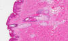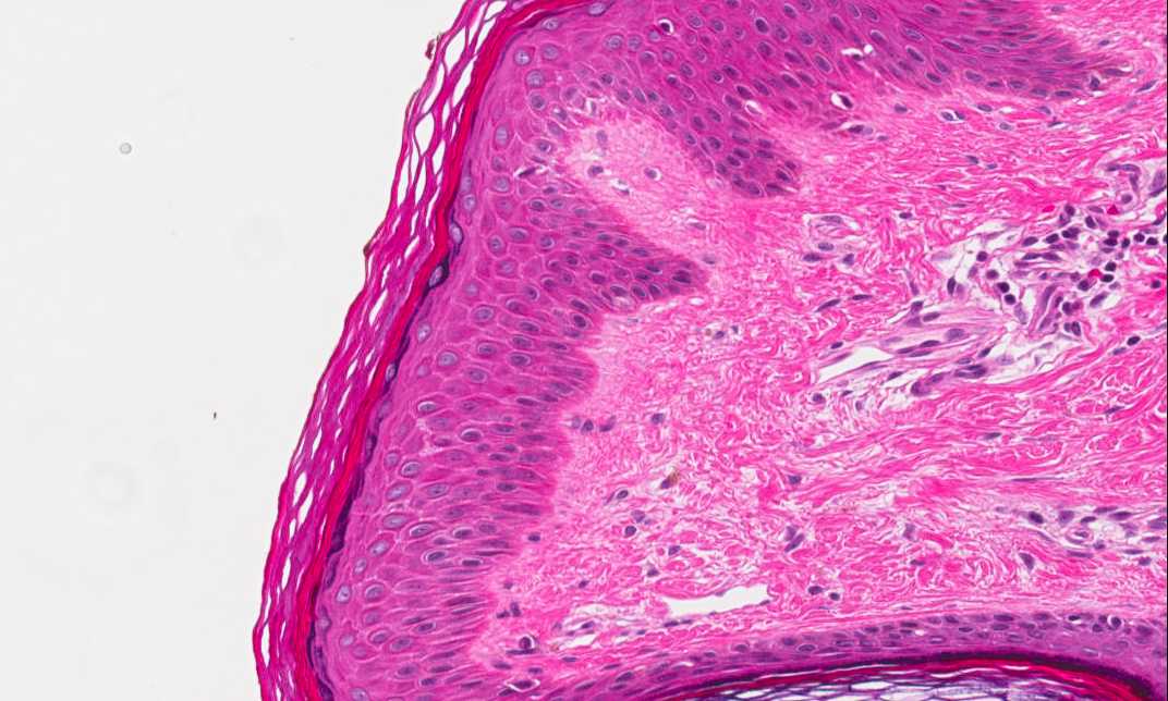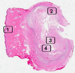 Area 1: This image is taken from the epidermis. You can see keratinizing squamous epithelium with skin appendages. These features identify this specimen as skin. |