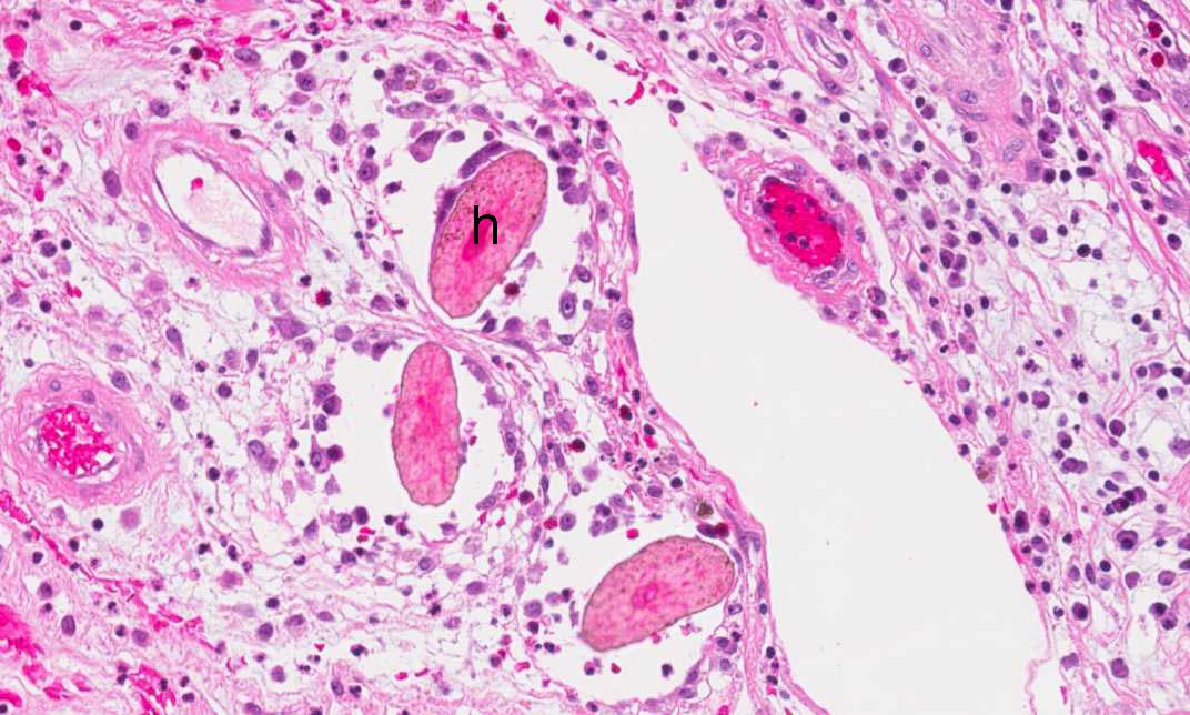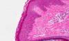 Area 2: The periphery of the lesion is lined by granulation tissue, chronic inflammatory cells and many oval structures. These structures are oblique cuts of hair shafts (h). The granulation tissue and chronic inflammation are reactive changes. |