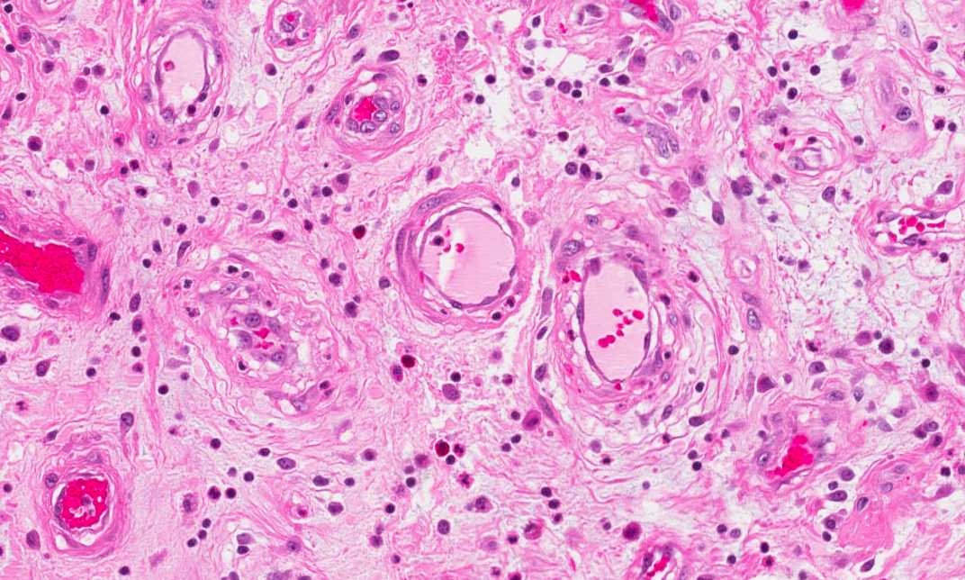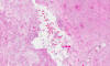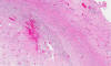 Area 3: Note that the center of the cystic lesion is also filled by a few hair shafts. The granulation tissue and inflammatory cells are reactive changes. Note that numerous blood vessels (arrows) are present in the granulation tissue. |