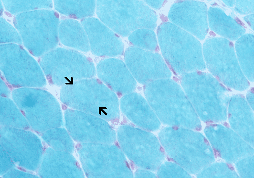 On modified Gomori's trichrome stained frozen sections, the observations are very similar to that of the hematoxylin-eosin stained section. A vaguely defined core, sometimes granular, can be seen in many fibers (àÝ). They are very subtle and are much better appreciated under the microscope than on computer screens. |