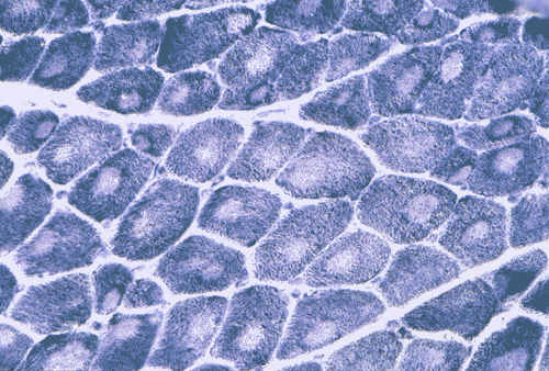 Clinical information: The patient was a 5 year-old girl with muscle weakness and pain. Her condition was non-progressive. She had chronic pain in the leg since 18 months of age and the pain tended to occur at around 5 o'clock in the afternoon. There was no cramping. Her motor milestones were slightly delayed; as per her mother, she started walking and running later than other children but the exact delay was not clear. She had mild difficulty in climbing stairs and needed to use hand rails. She also had pelvic girdle weakness and some truncal hypotonia and instability. A partial Gower's maneuver was necessary when she arose from a supine position. There was no evidence of decrease in facial weakness or facial expression. There was an absent of joint reflex. Her serum creatine kinase level was normal. Her mother also suffered some muscle pain as a child and had decreased facial expression. A muscle biopsy from the left thigh muscle was performed and yielded the following specimen.