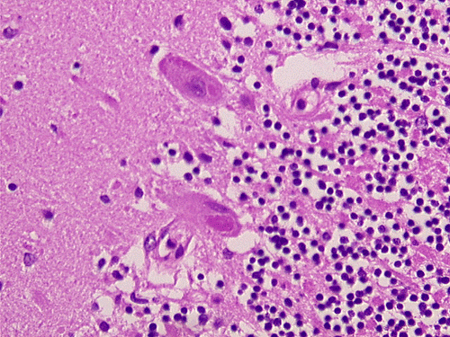 The brain and spinal cord may appear swollen but are usually free of focal lesions. Histopathologically, rabies is a widespread polioencephalomyelitis. Leptomeningeal and parenchymal perivascular lymphocytic infiltrations are usually present but often not intense. Neuronophagia can also be seen. The amount of inflammation of the case under discussion is, in fact, on the intense side of the scale. The pathognomonic Negri bodies 10, 11, 12 are sharply delineated, round to oval, eosinophilic, neuronal cytoplasmic inclusions; first described by Negri in 1903 10. These inclusions are often solitary but may also be multiple in a single neuron. Lyssa bodies refer to less well delineated and more pleomorphic neuronal cytoplasmic viral inclusions. Babes’ nodules refer to clusters of microglia that remain after destruction of neurons. When immunohistochemistry is employed, the distributions of viral antigen are far more extensive than that estimated by conventional light microscopy 13. Negri body and rabies viral antigen as demonstrated by immunohistochemistry are most commonly seen in large neurons of the hippocampus (Pyramidal cells), cerebellum (Purkinje cells), thalamus, basal ganglia, cerebral cortex and in the brain stem, especially gray matter of the pons and medulla. They are also found in spinal cord motor neurons and dorsal root ganglion, especially in the paralytic form. Immunohistochemistry also demonstrated rabies viral antigen in astrocytes and oligodendrocytes 13. Characteristically, a striking discrepancy between the degree of inflammation and amount of inclusion bodies is observed, as in our case, in many cases.