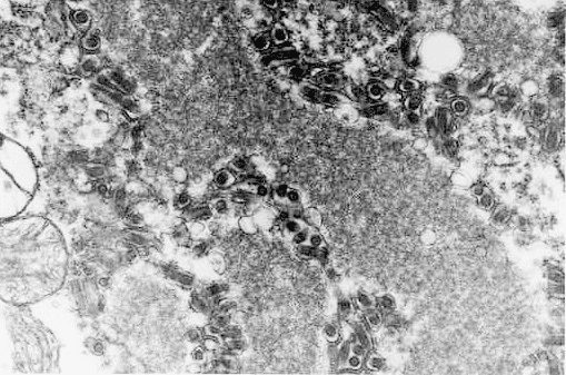 The overall tissue preservation is less than optimal because of postmortem autolysis. Panel A and B are taken from the cerebellum. The molecular layer, Purkinje cell layer, and internal granular layer are included (Panel A). Solitary eosinophilic intracytoplasmic inclusions of variable size are present in the Purkinje cells. No inflammatory cell infiltration is present in the cerebellum. The vacuolar spaces (Panel B) is partly due to autolysis and partly due to hypoxic/ischemic changes. Pyramidal cells in the hippocampus (Panel C), cortical neurons in parietal lobe (Panel D) and other neocortical areas adopted an elongated and contracted contour with loss of nuclear details. These are histologic features consistent with hypoxic/ischemic changes. Similar to the cerebellum, solitary eosinophilic cytoplasmic inclusion bodies are present and there is no inflammatory cell infiltration. Multiple eosinophilic cytoplasmic inclusion bodies within a single neuron are occasionally found. Some of these neurons containing multiple inclusions from the substantia nigra are illustrated in Panel E. Although inflammatory cell infiltration is scant in the cerebrum and cerebellum, perivascular chronic inflammatory cell infiltrations are common in the medulla (Panel F and G), in the paravertebral sympathetic ganglion (Panel H and I) and in the spinal cord (not shown). Intracytoplasmic inclusions, however, are not found in the medulla, spinal cord, and paravertebral sympathetic ganglion. Under the electron microscope, rod-shape or bullet-shaped viral particles are found (Panel J).