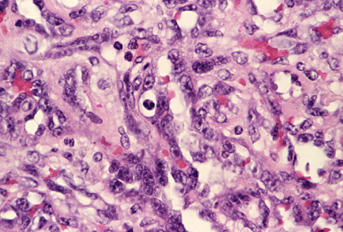anaplastic endothelial cells. These vascular channels proliferate and infiltrate