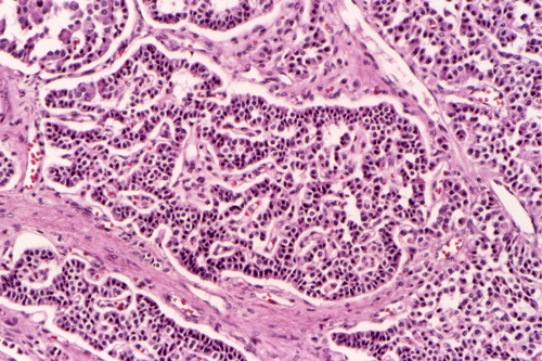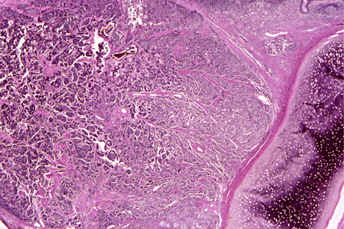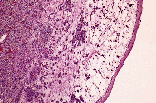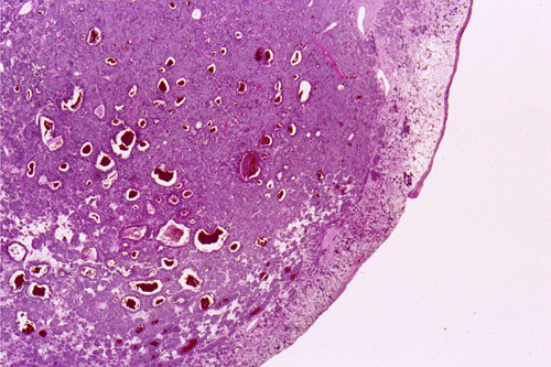 Clinical information: The patient was a 17 year-old boy who was in good health and was an active basket ball player. There was no history of asthma or other major illness. He developed chronic cough, wheezing and shortness of breath about 13 months before presentation. The patient was initially treated in an outside facility under the clinical impression of asthma and his condition improved. Two months before presentation to our institution, he developed fever spikes with worsening of his cough and sputum production. There was also a weight loss of 10 pounds. His pulmonary function tests showed an obstructive pattern with both inspiratory and expiratory abnormal flow volume loops suggestive of variable intrathoracic airway obstruction. The PPD test was negative. A chest x-ray revealed mild atelectasis in the right upper lobe. A bronchoscopy was performed and a biopsy was taken. Based on the pathology results of the biopsy, a lobectomy of the right upper lobe was performed. The following photographs were taken from representative areas of the surgically resected specimen.