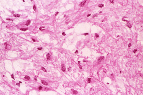 Microscopically, pilocytic astrocytomas characteristically contain alternating densely packed areas and loosely packed areas. The cellularity is moderate but can be focally hypocellular or hypercellular. The tumor cells have elongated, coarse, hair-like cytoplasmic processes. The nuclei are usually bland, small to medium sized and has open chromatin. A variety of patterns can be seen. The loose tissue is composed of minute vacuoles, microcysts, and eosinophilic fluid-filled spaces, which can coalesce into larger structures. A variety of histologic patterns as illustrated in this case can be found. Rosenthal fibers, varying in amount from a few to substantial, may be found and are particularly common in the fibrillary areas. Eosinophilic granular bodies are aggregates of eosinophilic globules and they are often found in pilocytic astrocytoma. Their presence is related to the benign nature of these tumors. Glomeruloids of blood thin walled blood vessels are also common findings. Extension into the leptomeninges is common and does not signify malignant behavior. Tumor necrosis is an uncommon features and should be distinguished from infarction of tumor. In longstanding cases, degenerative atypia may occur. The proportion of cycling cells as measured by immunohistochemistry for Ki67 is usually under 5%. Occasional mitoses may be found but they are not indication of aggressive behavior.