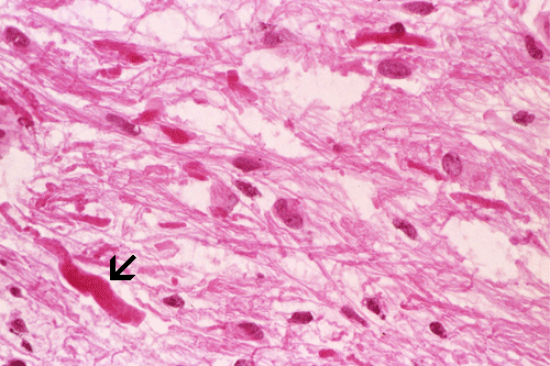 Alexander's disease is a leukodystrophy that is seen most commonly in infants or later childhood and is clinically a progressive, sometimes very slow, process with dementia, seizures and spasticity. Pathologically, it is also characterized by widespread accumulation of Rosenthal fibers. Initially, the Rosenthal material accumulates in the astrocytic cell body but eventually located at the end-feet. There is also gliosis and extensive myelin disintegration. Rosenthial fibers are found throughout CNS but are most commonly seen in subpial, subependymal, and perivascular sites and their distribution does not always correlate with the myelin loss and can be found in areas without myelin abnormalities such as pontine tegmentum. Astrocytes contain eosinophilic globules with ultrastructural features of Rosenthal material. Nuclear atypia can also occur in the astrocytes. Progression of Alexander's disease is usually symmetrical and involves the frontal lobes with extension into thetemporal and parietal lobes. The clinical and imaging features usually allows recognition without biopsy. The etiology is related to mutations of the glial fibrillary acidic protein (GFAP).