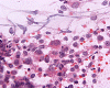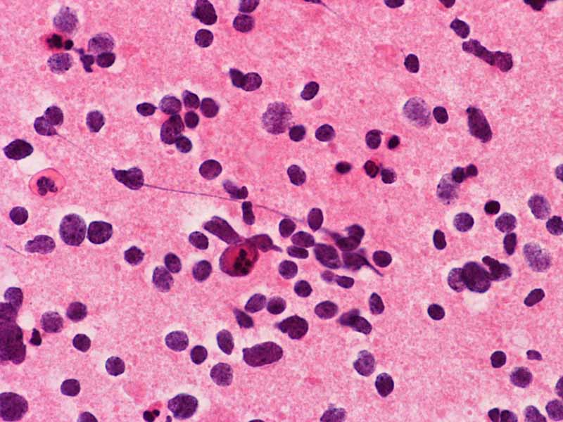 Medulloblastoma, cytologic preparation. Note the lack of prominent nucleoli in comparison to AT/RT in Panel A. One must be alerted that anaplasic/large cell medulloblastomas do contain prominent and may be difficult to be separated from AT/RT with minimal rhabdoid changes. |