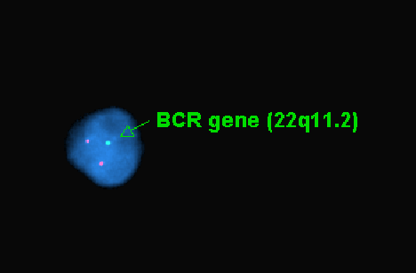 A piece of fresh tumor tissue was sent for cytogenetics studies at the time of frozen section because of the high suspicion of AT/RT. Routine chromosomal analysis revealed that all twenty cells had apparently normal karyotype. No consistent structural or numerical changes were found. Fluorescence in situ hybridization (FISH) analysis utilizing the BCR gene on 22q11.2 region was also performed, no deletion of 22q11.2 region was detected. However, on interphase FISH of paraffin sections utilizing the same probe as illustrated in Panel N, only one hybridization signal of the BCR gene at chromosome 22q11.2 (green dot) could be detected but the control ABL gene had two dots (red dots). These findings indicated a heterozygous deletion of chromosome 22 involving at least 22q11. 2, which is commonly associated with AT/RT.