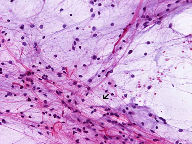 Pilocytic astrocytoma, cytologic preparation. Note the long cytoplasmic processes (arrow). These processes are typically seen in glial neoplasm in particularly the lower grade ones. Note the lack of prominent nucleoli also. |