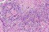 Central giant cell "reparative" granuloma is a benign non-neoplastic giant cell lesion arising centrally within the jaws. The name is a misnomer since these lesions do not contain granulomas and are not necessary reparative. They are locally destructive and usually affect children and young adults, predominantly females. They are most frequently seen in tooth bearing areas of the mandible, followed by the maxilla, and infrequently seen in small bones of the fingers. Radiographically, they present as osteolytic lesions similar to aneurysmal bone cysts. Histologically, there are lobules of connective tissue composed of fibrobrast-like spindle cells, collagen, and foci of hemorrhage within which multinucleated giant cells of osteoclast type are clustered. Hemosiderin deposits and reactive woven bone may be present. These lesions are histologically indistinguishable from brown tumors associated with hyperthyroidism. In general, these lesions lack the stigmata of a sarcoma. It should also be noted that biopsy material that are obtained from the periphery of an osteosarcoma my mimic central giant cell granuloma.