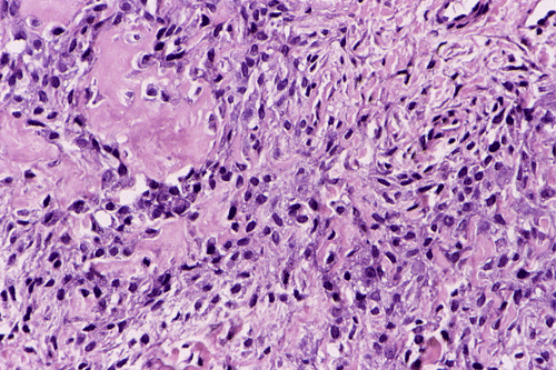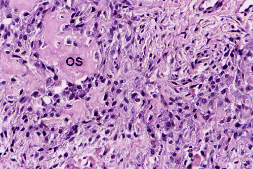 Osteosarcoma is a malignant tumor characterized by direct formation of bone or osteoid by the proliferating neoplastic cell. Other than sharing this characteristic, osteosarcoma is one of the most heterogeneous tumor from the histopathologic perspective. The histologic features vary from different areas of the same tumor and among different tumors. In general, several major patterns are recognized: osteoblastic, chondroblastic, fibroblastic, giant-cell rich, small cell, telangiectatic, and others. The amount of osteoid and ossified tissue can vary tremendously and it is not uncommon that it can only be found after careful search. The osteoid can form well-defined structures that mimic trabecular bone or as irregular deposits. The current trend is to classify osteosarcomas into low- and high-grade tumors. It is the histologic grade rather than tissue pattern that has greatest bearing on prognosis.
