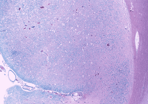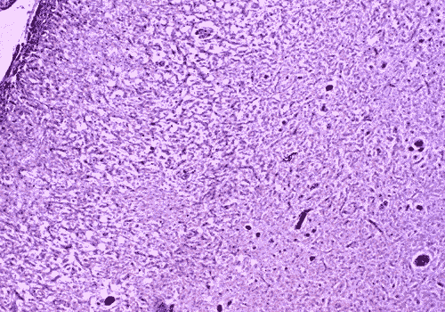 Histologically, the salient feature is a disorganized lesion featured by perivascular meningothelial cells intermingled with a fine, rich vascular network. Although each lesion is unique, increased cortical vascularity and perivascular cellular proliferation are constant findings. Irregularly branched blood vessels extending into the gray matter from the meningeal surface are surrounded by a concentric arrangement of proliferating spindle-formed cells .The overall structure can occur as nodules, whorls, or bands. Islands of cortical tissue with gliosis are often trapped within the lesion. The ratio between meningothelial component and vascular component varies substantially. There are lesions predominantly composed of vascular component or meningothelial component 3. A schwannian component can also occur. There are also cortical meningovascular fibroblastic proliferation and leptomeningeal calcifications that range from faint psammomatous calcification to dense osteoid. Residual neurons entrapped within the lesion may contain neurofibrillary tangles with ultrastructural and immunostaining properties identical to those seen in Alzheimer's disease but there is no deposition of amyloid Ab.