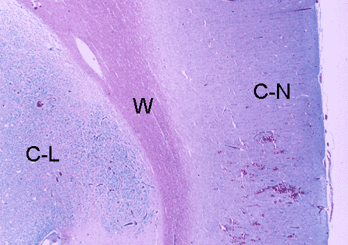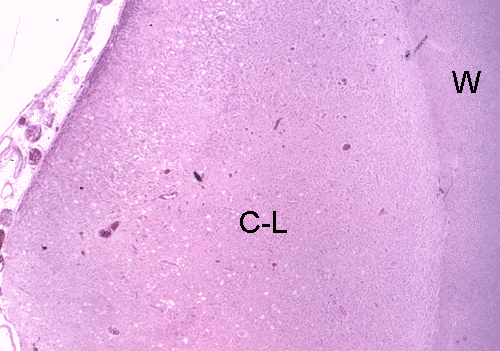 Gross pathology: In the cortex, there was a 2.0 cm wide poorly demarcated cortex that appeared unusually firm, pale, and thickened.