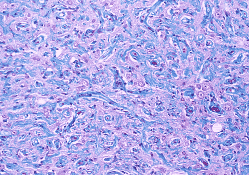 Myofibroblastic/fibroblastic origin: Paulus 16 have suggested a fibroblastic (probably perivascular) origin on the basis of association with procollagen I and III, lack of collagen IV, and vimentin immunoreactivity. Immunoreactivity for smooth muscle actin in the spindle cells of MA suggest a myofibroblastic origin 17, 18.