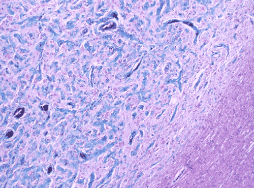 Giangaspero et al. 10 reported two cases of MA associated with meningioma and they underscored the features distinguishing this combination from meningiomas invading the brain tissue. Extension of meningiomas along the vessels in the Virchow-Robin spaces does not technically represent parenchymal invasion but may indicate an increased probability of recurrence. True invasion is present when neoplastic cells break through the pia mater to involve the underlying cortex and encircle islands of heavily gliotic tissue. Such a condition may be closely simulated by MA in which gliotic cortical tissue is encircled by meningothelial cells and fibroblasts characteristically disposed around blood vessels. Moreover, residual cortical neurons frequently contain neurofibrillary tangles indistinguishable from those seen in Alzheimer's disease. Although neurofibrillary tangles have been observed in the cortex of various conditions not related to Alzheimer's disease, they have not been reported in cerebral cortex invaded by meningiomas 10. The presence of neurofibrillary tangles and profuse cortical microvasculature would support a diagnosis of MA. Lack of meningothelial atypia, necrosis, or cortical destruction favor MA.
