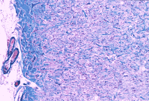 Ultrastructurally, the proliferating cells are composed of elongated heterochromatin-rich nuclei and slender cytoplasm-containing microfilaments, occasionally associated with desmosomal junctions and basal lamina like structures.