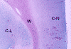 Histopathology: On histologic examination, the cortex lesion (C-L in Panel A) appear fibrous and vascular. It is well demarcated from the white matter (W in Panel A). The cortical lesion respects the grey-white junction and the interface is smooth. These features are better appreciated on Masson's trichrome stain. While one side of the gyrus is replaced by the lesion (C-L in Panel E), normal cortex is present on the other side of the gyrus (C-N in Panel E). White matter (W in Panel E) and the normal cortex (C-N in Panel E) carry a pink hue on Masson's trichrome.he fibrous lesion (C-L in Panel E) does not carry much of this pink hue. The lesion essentially follow the shape of the gyrus with some cortical thickening (Panel F). On higher magnification, the cortical lesion is highly vascular (Panel B, C, and G). In between the fibrous vascular component, there are entrapped islands of cortical tissue (Panel D, H, and I ). There is a general lack of pleomorphism and mitotic activities in the lesion.