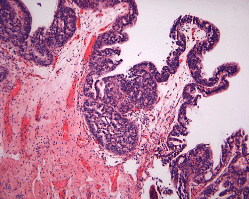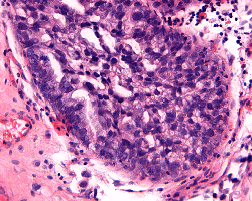 Three distinct architectural patterns have been described: papillary, cribriform and flat 2, 3, 4. Papillary architecture is the one most commonly seen, followed by cribriform pattern. Individual cases rarely show a pure pattern; rather, various combinations of the three patterns are more often seen.