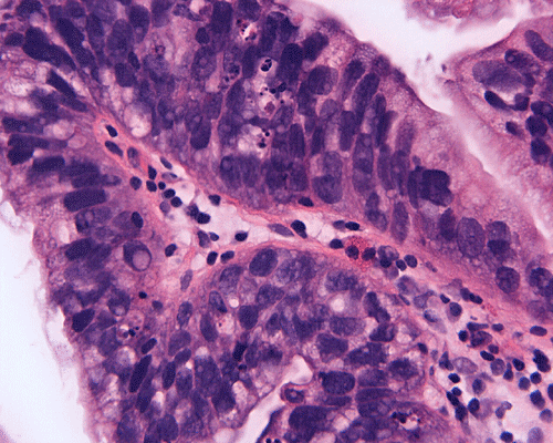 Adenocarcinoma in situ of the urinary bladder 1 is a rare lesion 2, 3, 4, 5, 6. In one institution it accounted for only 0.61% of all bladder biopsies from both consult and in-house cases 4. There appears to be a male predilection (79%) for this lesion with 74.4 years of age as the mean age at diagnosis (range 48-88 years) 4. It is often associated with urothelial carcinoma in situ and/or invasive urothelial carcinoma. Chan and Epstein 4 found that 74% of the patients in their series of 19 patients had invasive carcinoma on either concurrent or subsequent specimens. Compared with urothelial carcinoma in situ it appears that adenocarcinoma in situ is associated with a much higher rate of invasive carcinoma 4, 5, 6. Additionally, more than 20% of the cases were associated with either small cell carcinoma or micropapillary urothelial carcinoma 4, both of which are otherwise rare tumor types, and are associated with poor prognosis 2, 3, 4.