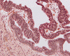 The papillary architectural pattern of in situ adenocarcinoma may resemble that of a papillary urothelial carcinoma in situ 1, however the latter does not have the columnar cells, characteristic of glandular differentiation and they do not produce mucin as illustrated in our case. Papillary urothelial carcinoma are characterized by delicate filiform processes, often with a fibrovascular core, that are not seen in adenocarcinoma in situ. Additionally, the cells of both in situ and invasive micropapillary carcinoma are cuboidal with high nuclear to cytoplasmic ratio in contrast to the columnar cells of in situ adenocarcinoma. In situ adenocarcinoma with the cribriform pattern may also be mistaken for an urothelial carcinoma in situ with so-called “gland-like lumina”. This latter is characterized by small cystic spaces containing mucin. True glandular differentiation with atypical columnar epithelium is not seen in such cases.