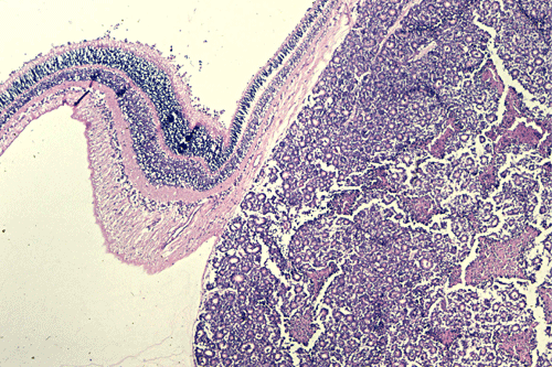 On the whole mount of the globe, there is an exophytic neoplasm that occupies about one-third the volume of the vitreous. The surface of the retina is free of tumor deposition (Panel A). The retina is detached by the mass. There are some pink, necrotic material at the core of the tumor (Panel B). On medium and high-magnification, the tumor is composed of densely packed small cells with hyperchromatic nuclei without prominent nucleoli. A large number of the cells arrange in rossettes with a well-defined luminal border (Flexner-Wintersteiner rossettes) (Panel C and D). The tumor is confined within the globe and the optic nerve is free from invasion.