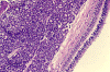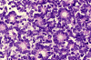 The pathology is typical for that of a small blue cell tumor with morphologic and immunohistochemical features comparable to medulloblastoma, supratentorial primitive neuroectodermal tumors, and adrenal neuroblastomas. Tumor cells have small to medium sized, hyperchromatic nuclei with clumpy chromatin and without prominent nucleoli. Only a small to minute amount of cytoplasm is present. Mitotic figures are numerous. Retinoblastoma has a striking tendency to undergo necrosis. The tumor cells that are closer to the blood vessels are more likely to remain viable. Calcifications are common findings in the necrosis. Some of the nucleic acid liberated from these necrotic cells becomes absorbed in the walls of blood vessels giving them a deep blue appearance.